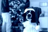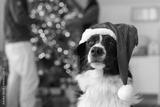 Cute Border Collie dog in Santa hat against couple at home on Christmas eve, closeup