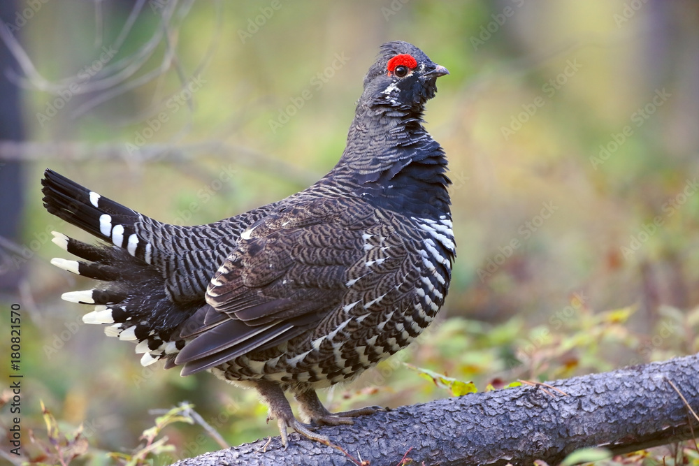 Spruce Grouse male standing on log in the forest, (Dendragapus Canadensis )