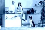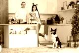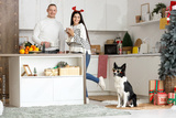 Young couple with cocoa and dog in kitchen on Christmas eve