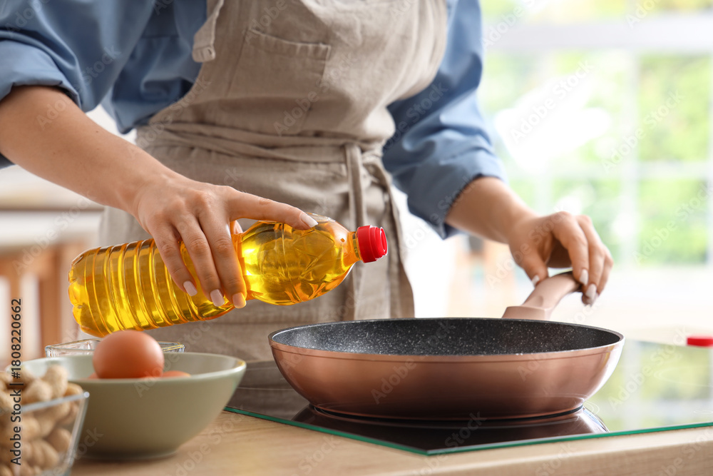Young woman pouring sunflower oil into frying pan in kitchen, closeup
