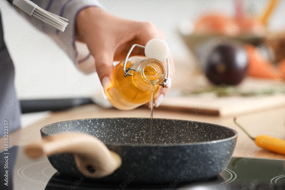 Woman with brush pouring sunflower oil into frying pan in kitchen, closeup