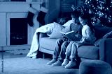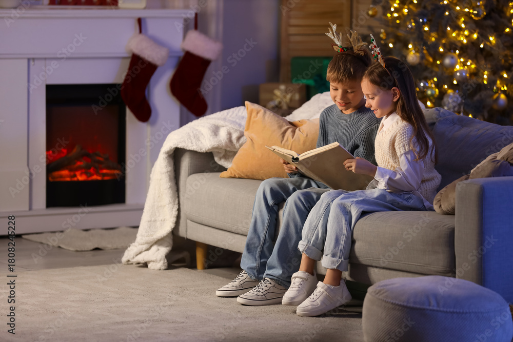 Cute little children with reindeer horns reading Christmas story on sofa at home in evening