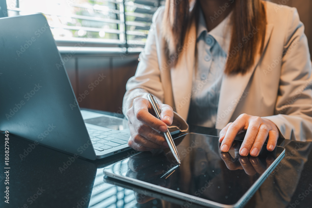 Professional woman working on a digital tablet and laptop in a modern office environment.