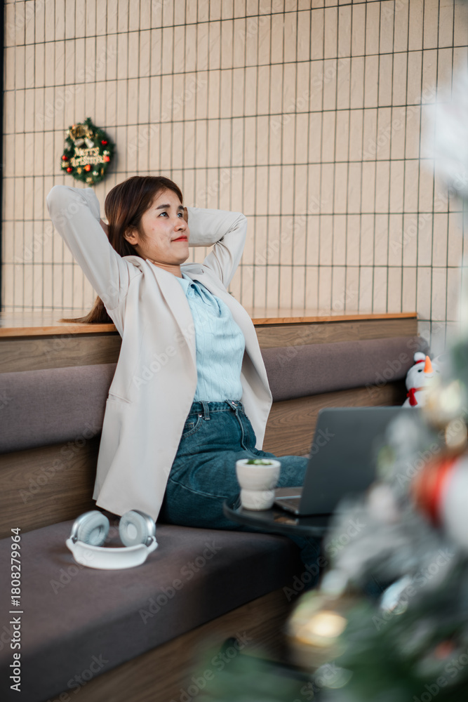 Woman in casual attire relaxing in a modern cafe with a laptop and headphones, surrounded by holiday decorations.