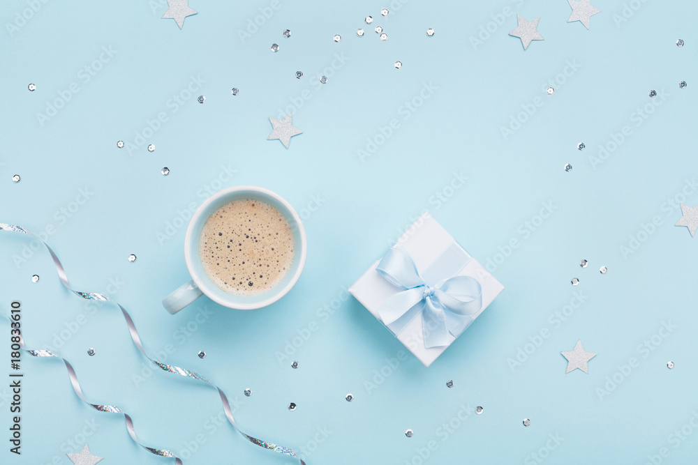 Cup of coffee and gift box on blue pastel table top view. Flat lay. Holiday morning breakfast from above.