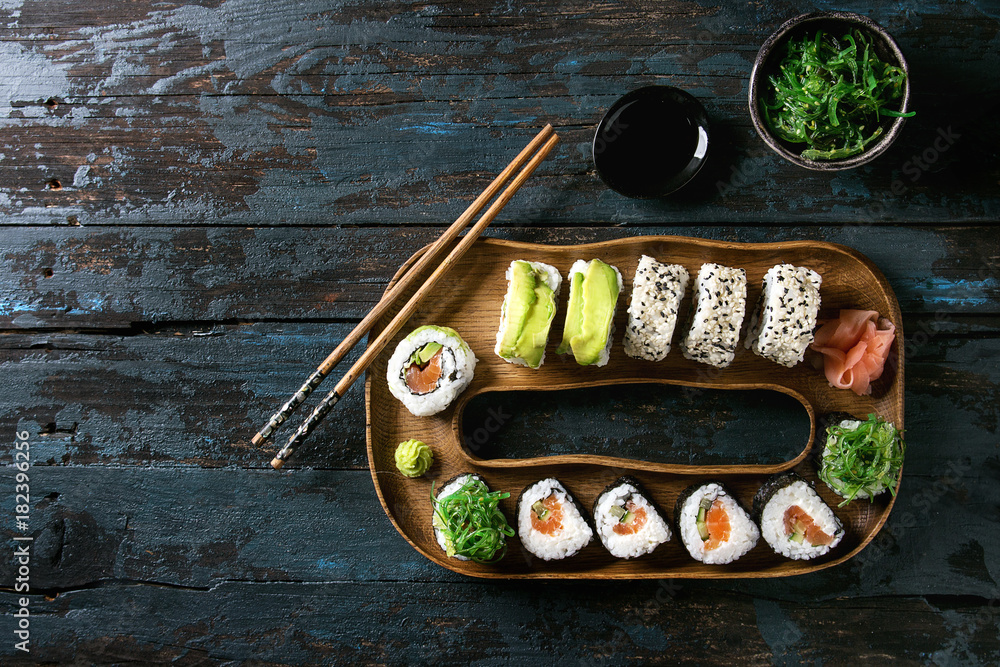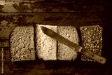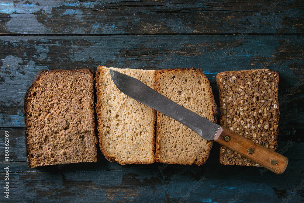 Variety loaves of sliced homemade rye bread whole grain and seeds with knife over old dark wooden background. Top view, space. Healthy eating
