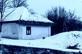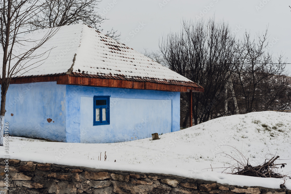 Charming snow-covered house with blue walls and red roof in winter landscape under overcast sky