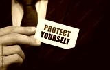 Businessman putting a card with text PROTECT YOURSELF in the pocket