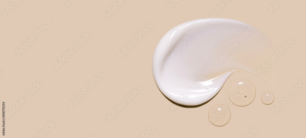 samples of cosmetic care products smear of cream serum texture on a beige background, moisturizing and skin care concept