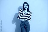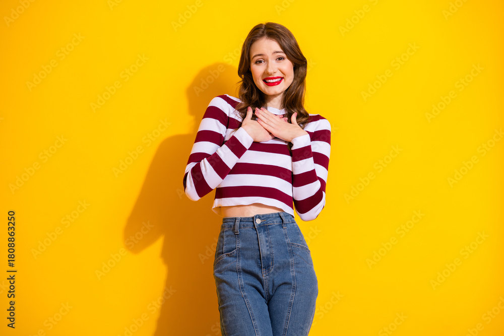 Bright young woman in striped burgundy and white top smiles against yellow background casual fashion stock photo
