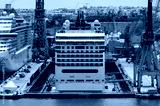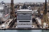 Modern cruise ship cruiseship liner Divina and Magnifica being modernized over-hauled repaired refitted maintenanced by shipyard in Malta with dock and cranes