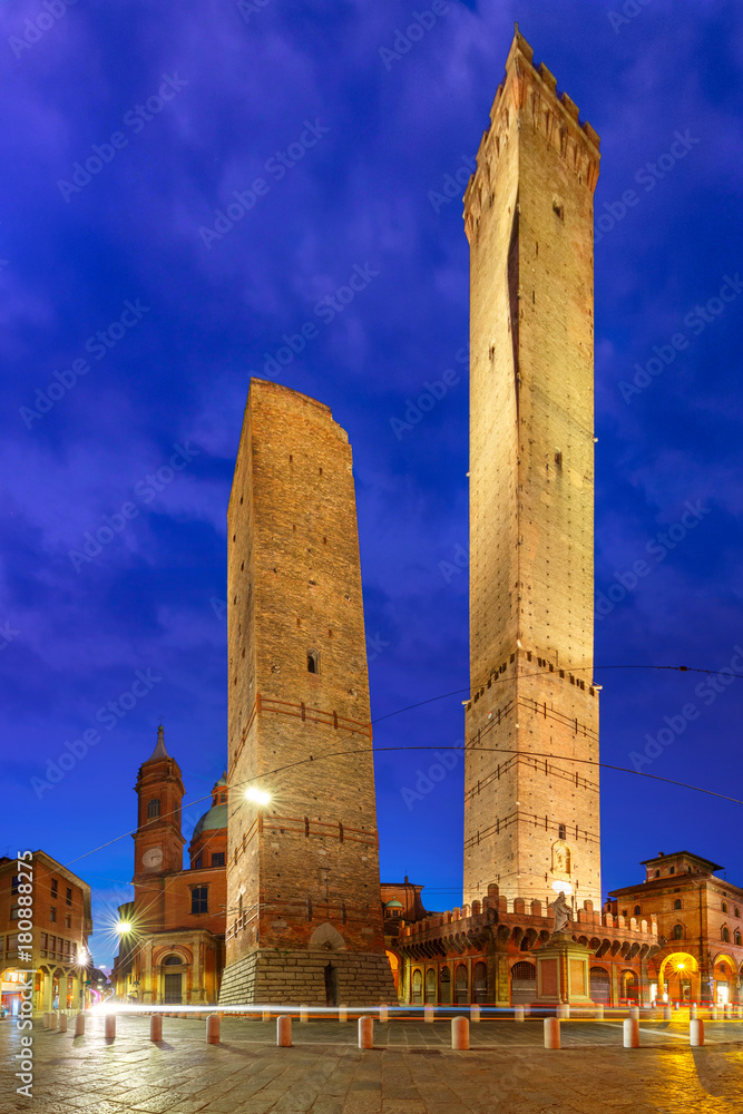 Two Towers, Asinelli and Garisenda, both of them leaning, symbol of Bologna, statue of San Petronius and Church of Saints Bartholomew and Gaetano in the morning, Bologna, Emilia-Romagna, Italy