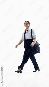 Businesswoman walking forward with travel bag and focused mood. Concept of mobility workflow, corporate lifestyle marketing, commuting visuals, professional travel promotion.