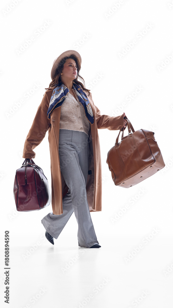 Businesswoman walking with two travel bags in confident active motion. Concept of mobility lifestyle graphics, business travel marketing, corporate communication visuals.
