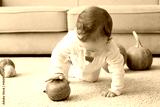 Adorable baby with pumpkins indoors