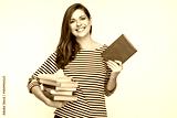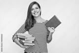 Beautiful girl holding pile of books.