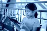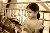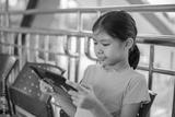 Young Girl Using Tablet While Sitting in Public Waiting Area