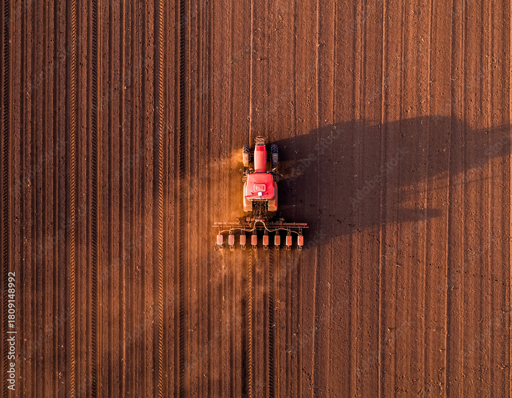 Farming tractor sowing seeds on cultivated agricultural field