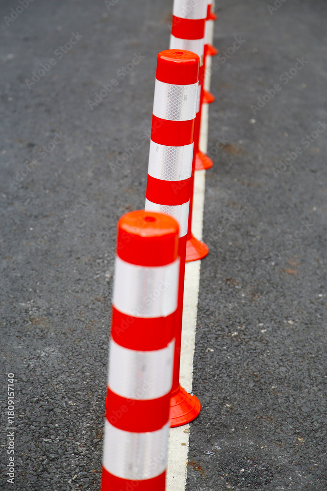 A row of orange and white reflective traffic bollards on a black asphalt road.