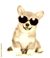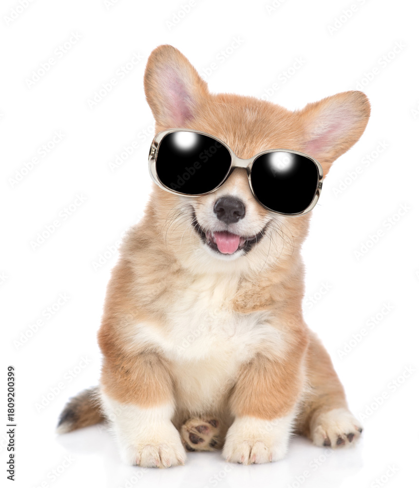 Happy Red Pembroke Welsh Corgi puppy wearing sunglasses sits in front view and looks at camera. isolated on white background