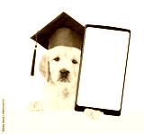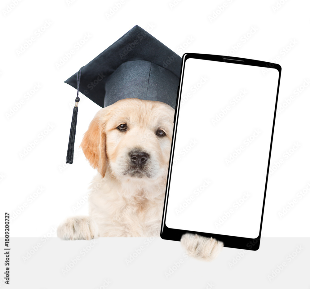Cute smart college graduate Golden retriever puppy holds big smartphone with white blank screen in it paw, showing above empty white banner. isolated on white background