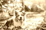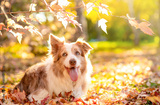 Happy Australian shepherd dog lying on fallen autumn leaves at sunny park. Empty space for text