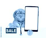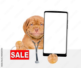 Happy Mastiff puppy wearing like a doctor with stethoscope on his neck showing signboard with labeled "sale" and smartphone with white blank screen in it paw above blank banner. isolated on white