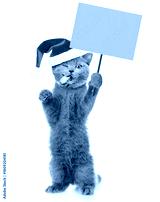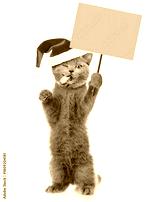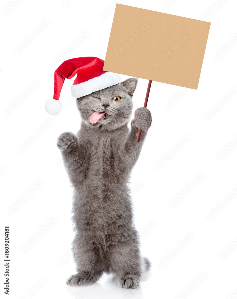 Funny winking cat with tongue out wearing red christmas hat standing on hind legs and showing blank placard on wooden stick. Empty space for text. isolated on white background