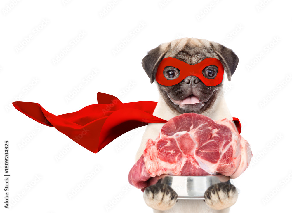 Funny Pug puppy wearing superhero costume holds bowl of raw meat. isolated on white background