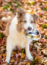 Hungry Australian shepherd dog holding a bowl in its mouth at sunny autumn park