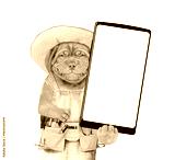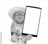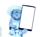 Smiling Mastiff puppy wearing summer hat and denim overalls with tool belt showing big smartphone with white blank screen in it paw. Isolated on white background