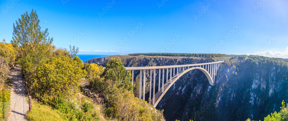 Aufnahme der Bloukrans Bridge im Tsitsikama Nationalpark in Südafrika bei blauem Himmel tagsüber fotografiert im September 2013
