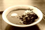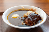 Japanese curry rice bowl, featuring a rich, dark brown sauce and a large hamburg steak or katsu cutlet.
