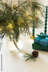 Christmas decoration with branches of pine tree, pine cone and string lights in glass vase. Close up