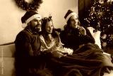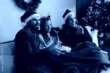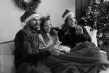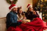 Happy family with daughter watching Christmas movie, eating popcorn while lying under blanket on sofa in living room with tree and glowing garlands