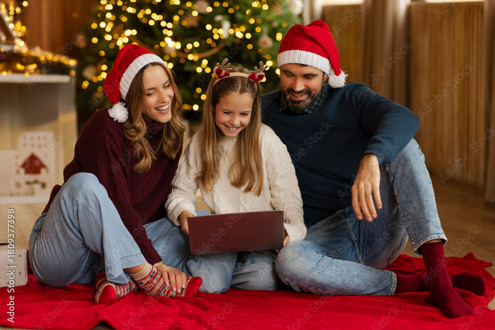Family sitting on blanket in front of decorated Christmas tree, sharing joyful moments while looking at laptop together, choosing presents for holidays