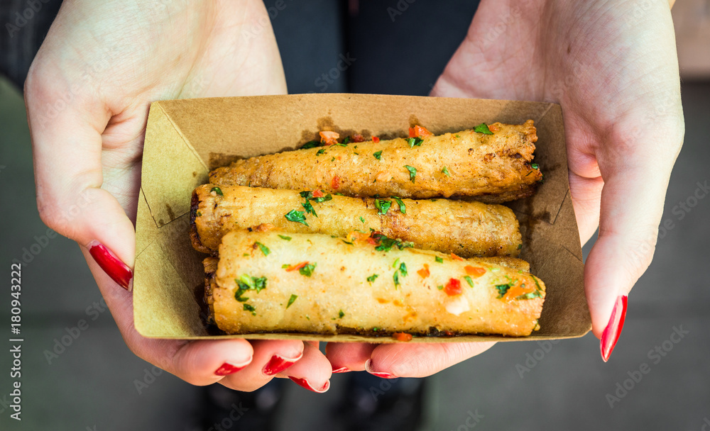 Deep fried spring rolls, Chinese cuisine staple, at a street food market