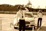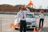 Fun by using cones. Man instructor in the driving school and woman are outside the car