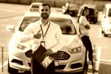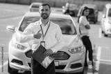 Documents in hands of a guy. Man instructor in the driving school and woman are outside the car