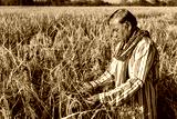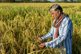 Elderly Asian farmer man wearing a long-sleeved shirt stands in paddy field, inspecting or analyzing rice plants before harvesting. Rice harvest season.