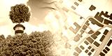GREEN INDUSTRIAL CONVERSION IN OUR CITIES, ENVIRONMENTAL REGENERATION - Zero CO2 emissions concept with a tree on top of a chimney and imaginary city map