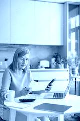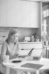 Senior woman at home checking documents and using a laptop and smartphone to calculate expenses, manage bills, and plan her household budget, focusing on retirement financial planning