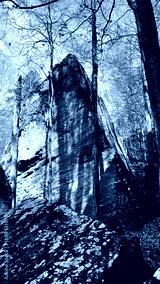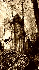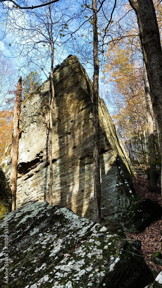 Ancient rock formation surrounded by trees in a southern Illinois forest scene