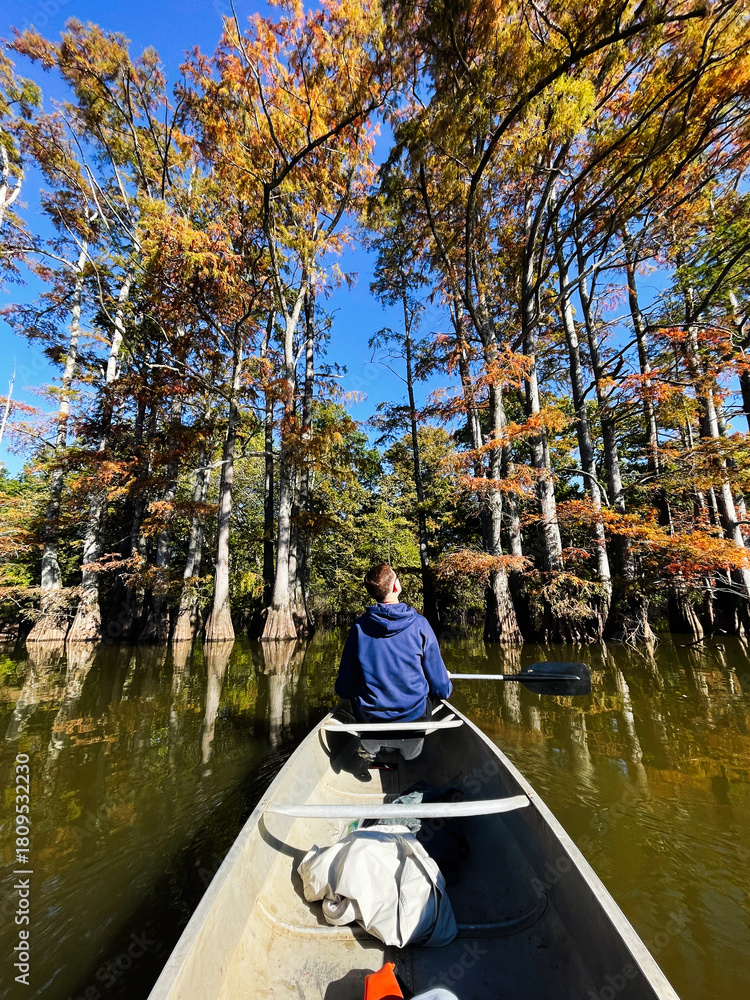 Canoeing through autumn trees in a southern Illinois swamp with clear blue sky
