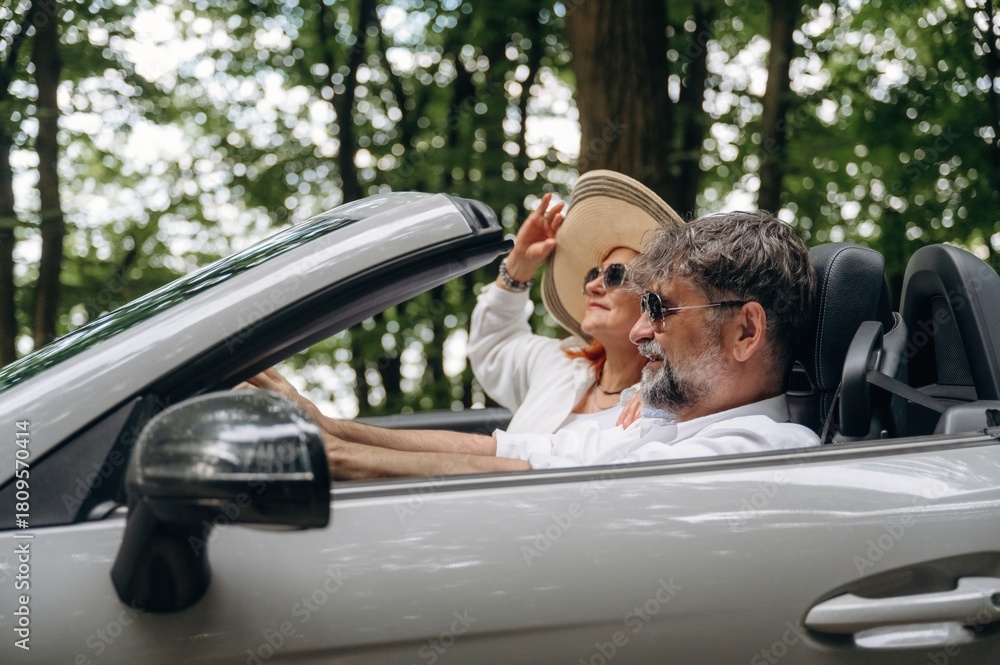 Enjoying the ride, in the hat, vacation. Senior couple driving convertible cabriolet car