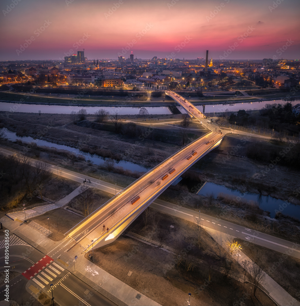 Kładki Berdychowskie nad rzeką Wartą i Cybiną w Poznaniu po zachodzie słońca