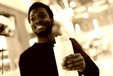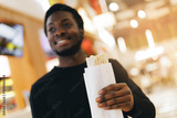 Smiling young african male enjoying shawarma wrap in a modern food court