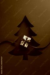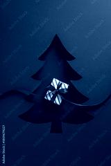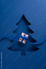 A vertical blue greeting card features a layered Christmas tree cutout with a small striped gift box tied by a blue ribbon, illustrating festive season, gift exchange, and holiday celebration
