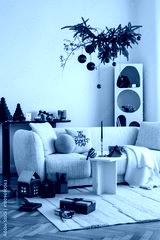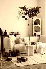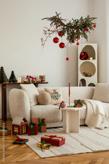 Warm Christmas living room featuring cozy textiles, holiday pillows, gift boxes, and a minimalist white table with festive decor.