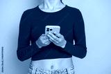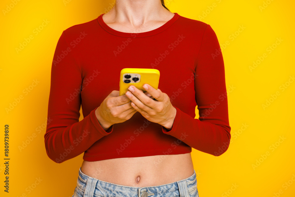 Young woman in a red crop top using a yellow smartphone against a bright yellow background showcasing casual fashion lifestyle and shopping